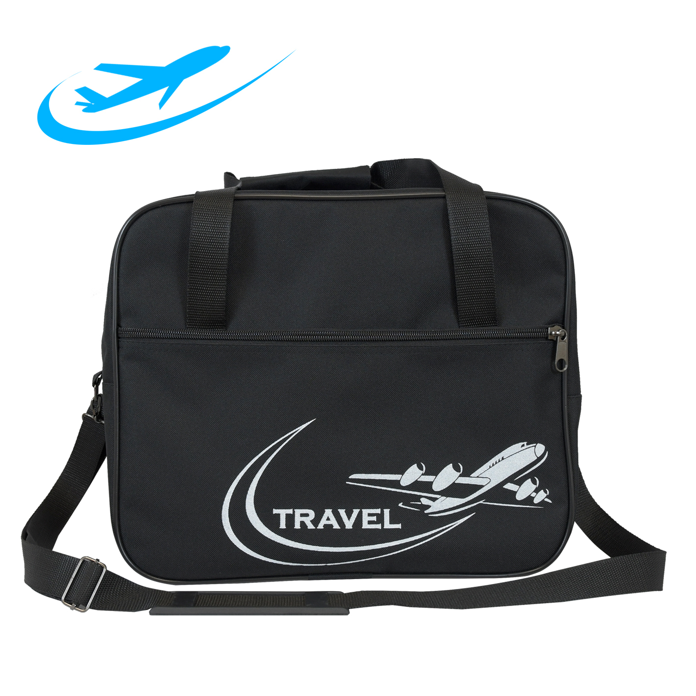Дорожная сумка предназначена для транспортировки личных вещей, в качестве ручной клади авиакомпании Победа. Изготовлена из прочного водоотталкивающего материала на ПВХ основе. Внутренние швы окантованы. Содержит вместительный основной отдел, на передней стенке один большой карман и карман на задней стенке, используемый также как держатель на выдвижной ручке чемодана. Дно укреплено специальными материалами, установлены четыре пластиковые пукли - ножки. Ручки с текстильным ручкодержателем, уменьшающим давление на ладонь. Фурнитура металлическая. Сумка оснащена длинным съёмным регулируемым ремнем с резиновым наплечником.